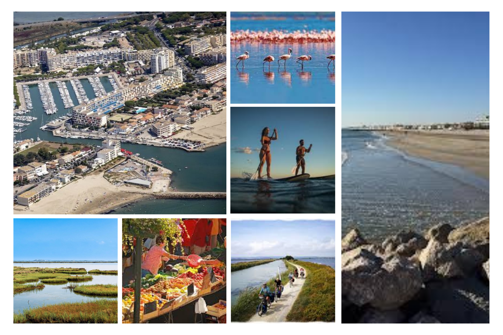📸 Découvrez l’ambiance du quartier en images : La mosaïque ci-dessous vous plonge dans l’atmosphère unique de Carnon, entre bord de mer, port de plaisance, et nature préservée.